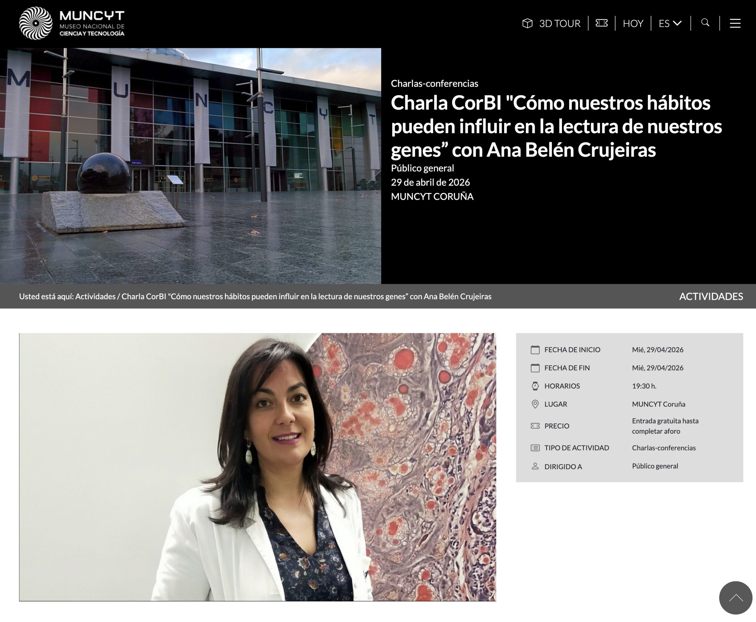 Santiago de Compostela, 28 de abrilde 2026.- La Dra. Ana Belén Crujeiras, líder del grupo de investigación Epigenómica en Endocrinología y Nutrición del IDIS, impartirá este miércoles una conferencia en el museo Muncyt de A Coruña. Bajo el título Alimentación saludable y epigenética, la investigadora explicará cómo la epigenética “ha revolucionado nuestra comprensión de la salud y nos ayuda a entender que nuestros genes no funcionan siempre igual: no son un destino fijo, sino más bien un conjunto de instrucciones que el cuerpo puede usar de distintas maneras”.