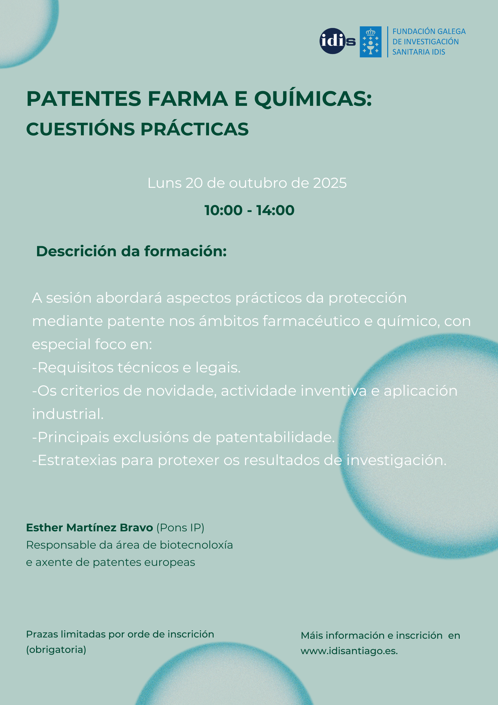 A Fundación Pública Galega Instituto de Investigación Sanitaria de Santiago, FIDIS, organiza a xornada “Patentes farma e químicas: cuestións prácticas” presentada por Esther Martínez Bravo, responsable da área de biotecnoloxía e axente de patentes europeas de Pons IP.